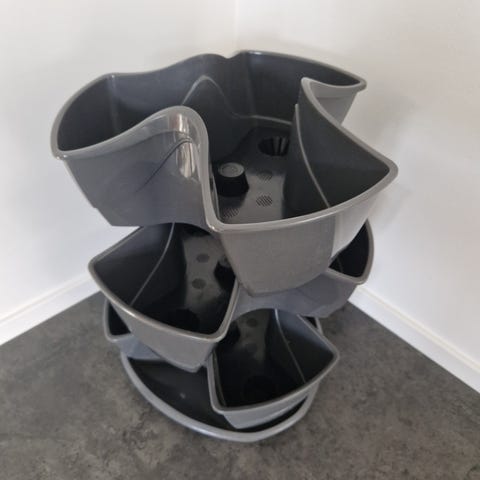 Sæt bestående af fire plantekasser i sort plast. Kasserne er designet til at kunne stables og har en trekantet form, som tillader nem placering og organisering af planter.