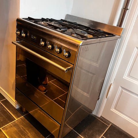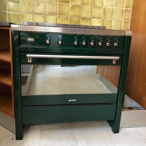 Smeg Gas Komfur med rustfrit stål finish. Komfuret har fire gasblus og ovn med manuel betjening. Designet til brug i køkkener til madlavning med gas.
