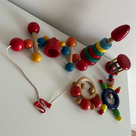BRIO børnelegetøj bestående af trælegetøj med forskellige former og farver samt en blød stofelefant. Legetøjet inkluderer en træstabletårn og en aktivitetslegetøj med perler på ledning. Egnet til små børn for motorisk udvikling og leg.