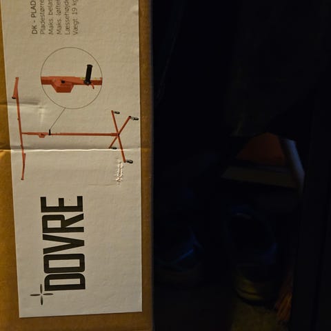 Dovre Pladehejs med hjul og håndsving til løft og håndtering af plader. Maksimal belastning på 68 kg og maksimal pladestørrelse på 122x488 cm.