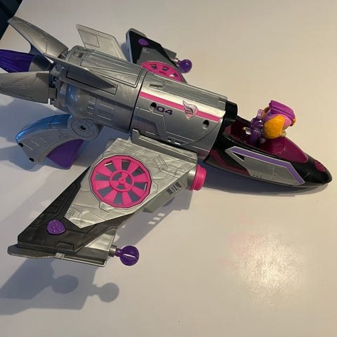 Paw Patrol legetøj fly i pink og grå farver med en medfølgende figur.
