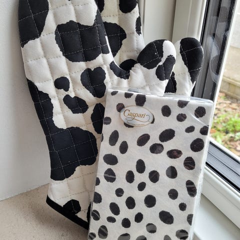 250 kr.🐄🐄Grillhandske Sæt + Servietter, Dalmatiner Ko mønster Grand DanoisFrederikssundFøj til favoritter.