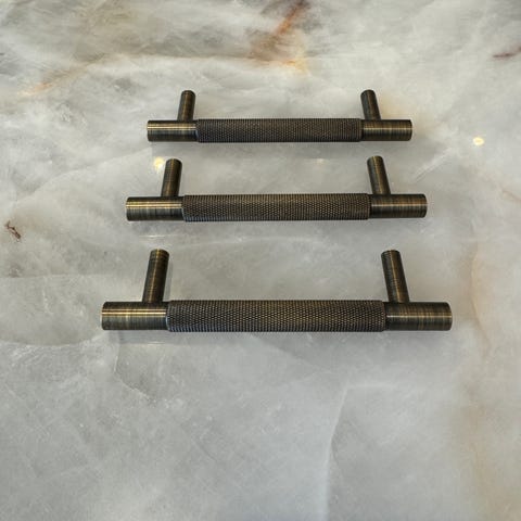 Sælger 35 stk. eksklusive greb/knopper i massiv børstet messing fra FINICC (model Hanover Cross).