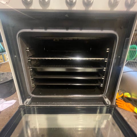 Voss keramisk komfur med glaskeramisk kogeplade. Komfuret med fire kogezoner og ovn med glaslåge sælges. Plader medfølger.
