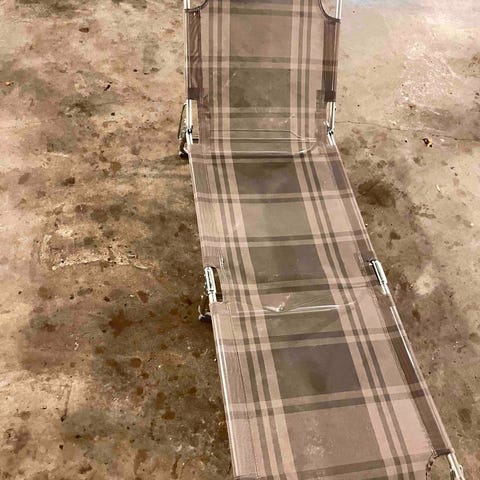 Solseng som er vildt dejlig at ligge i, i lyseblå. Der er brugsspor, som sikkert kan vaskes af, og lidt rust på undersiden af benene, som ikke kan ses når den står.