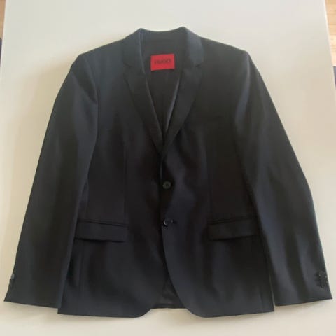 Hugo Boss Blå Herre Blazer i størrelse 48, lavet af polyester og bomuld. Jakken har to knapper foran, to lommer med klap samt en brystlomme. Indvendigt foret med detaljer i rødt. Passer til formelle og professionelle lejligheder. Brugt til konfirmation. Er efterfølgende renset.