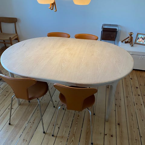 Ældre munkegaard stole som vi har fået ompolstret i semi anilin læder.