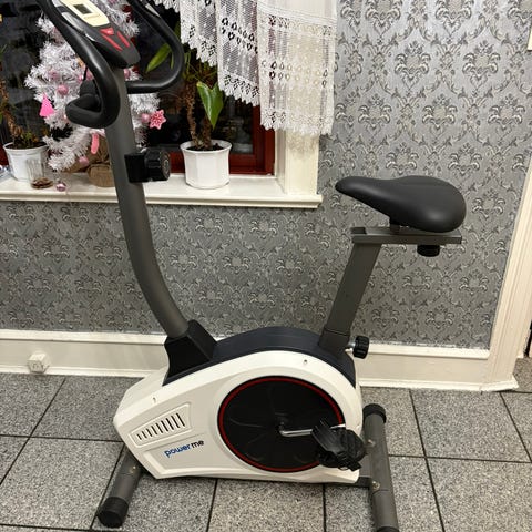 Trimline motionscykel med digitalt display der viser tid, distance, hastighed og kalorieforbrug. Cyklen har et justerbart sæde for tilpasning til brugerens højde. Sort farve og robust konstruktion egnet til indendørs træning.