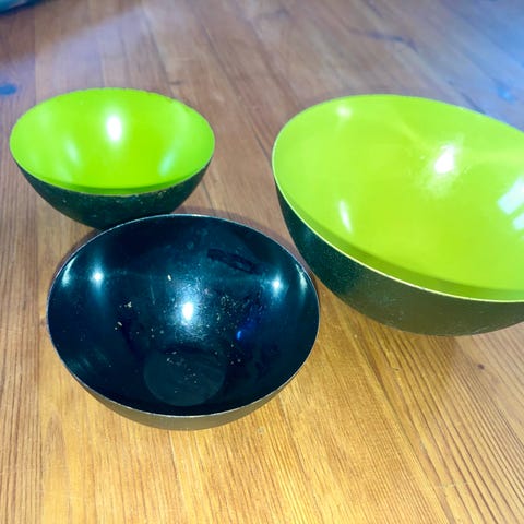De tre af skålene er af Normann Copenhagen og de andre to er "antikke", dvs. af ældre dato. 65 kr. pr. stk. eller alle fem for 275 kr.
