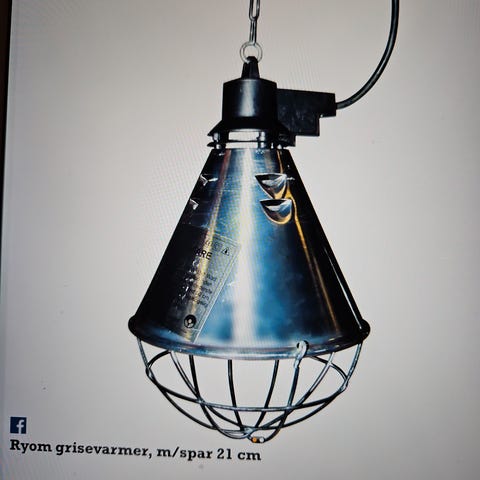 Ryom MS 1-2,5 STD Grisevarmer med CE-version. Varmeren er udformet i metal med beskyttende gitter. Brugt til høns. Pæren virker ikke.