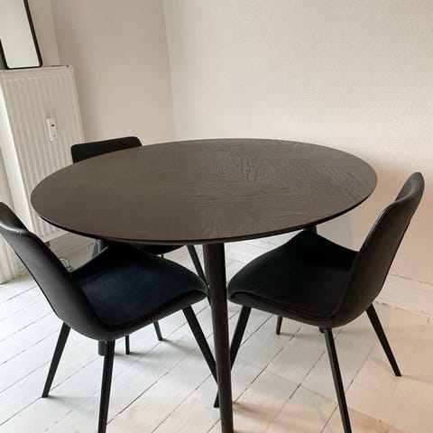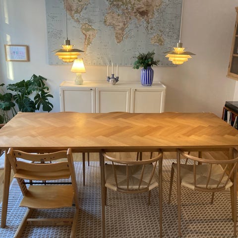 Lækkert spisebord med sildebens egefiner og ben i massiv eg.