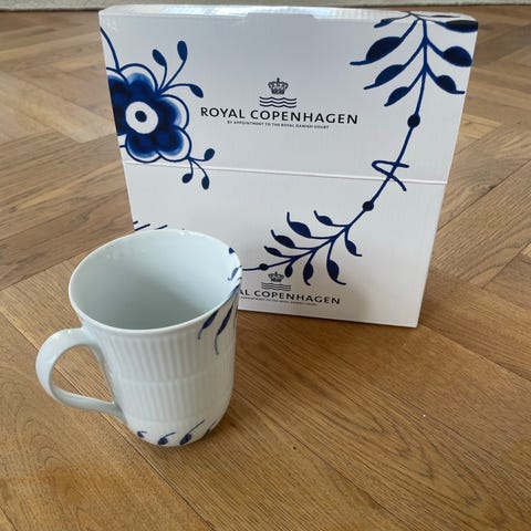 Royal Copenhagen Blå Mega krus i porcelæn med blå håndmalet blomstermotiv. Sættet indeholder 4 krus med hank, velegnet til servering af varme drikke. 2 er brugt meget få gange, 2 er helt nye
