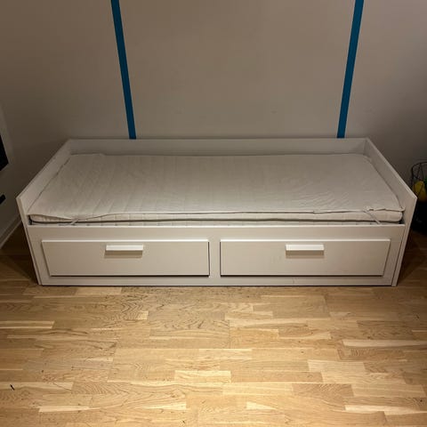 Der mangler to stykker træ i bunden. Vi har de dutter der skal i, så den kan nemt fikses hvis man køber to stykker træ. Man mærker ikke de manglende stykker træ når den er slået sammen.