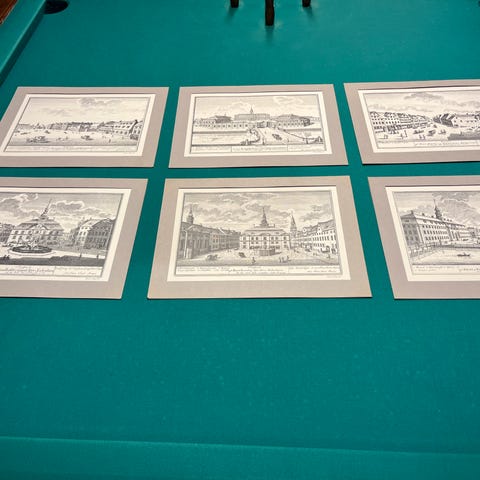 Sæt af blandede kunsttryk og plakater til vægdekoration med forskellige motiver og farver. Indeholder naturbilleder, abstrakte designs og botaniske illustrationer i varierende størrelser. Materiale og specifikke dimensioner ikke angivet.