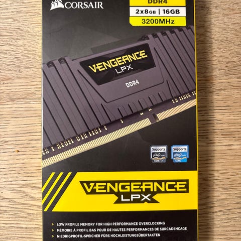 Corsair Vengeance LPX ddr4 RAM moduler med rød køleprofil og 16gb i alt (2x8gb) med 3200MHz. Slet ikke blevet brugt da det var et fejl køb.