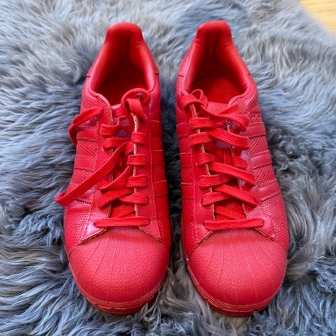Adidas sneakers i størrelse 40. Skoene har en rød farve med hvide striber og en gummisål. Velegnede til hverdagsbrug. Der er slidt små huller i stoffet ved hælen (se billede).