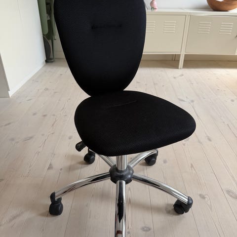 Hvidt stel, gråt sæde, højden kan justeres op og ned, står på 5 hjul, virker fint, nypris 449 kr