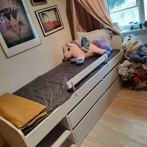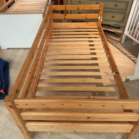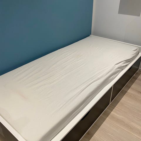 Fin robust seng med 2 store skuffer, med aftagelig sengehest. God madras medfølger.