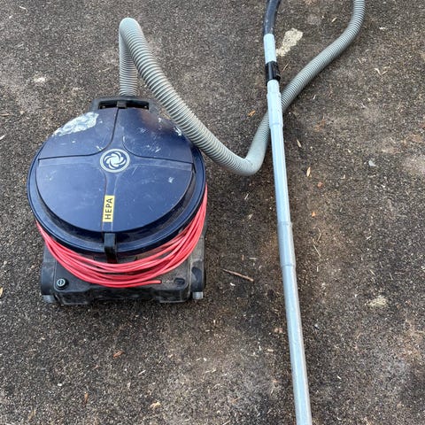 Nilfisk VP930 støvsuger med rund form og integreret håndtag. Udstyret med lang orange ledning til fleksibel brug. Velegnet til rengøring i forskellige miljøer.