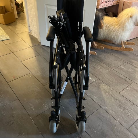 Transport kørestol med sort stofsæde og rygstøtte, foldbar konstruktion for nem opbevaring og transport. Udstyret med fodstøtter og håndtag til skubning. Velegnet til midlertidig eller mobil brug.