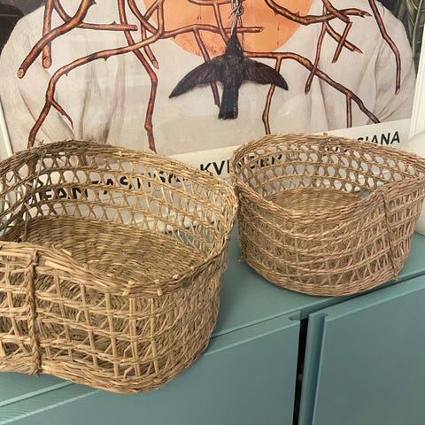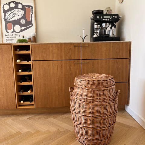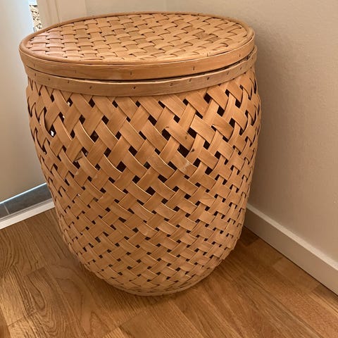 Håndflettet kurv lavet af naturmateriale med et rundt træhåndtag. Kurven har en rummelig, åben form og kan anvendes til opbevaring af forskellige husholdningsartikler.