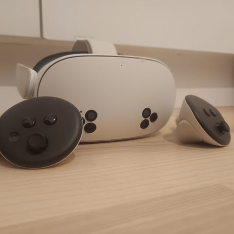Meta Quest 3S VR-headset med trådløs funktionalitet. Produktet leveres i original emballage og er beregnet til virtuel reality oplevelser.