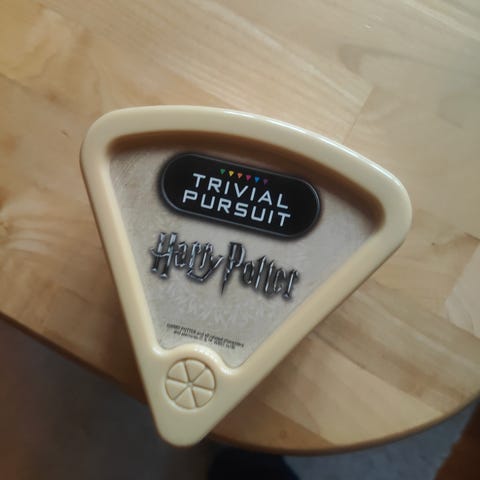 Trivial Pursuit Harry Potter med kort og terning i trekantet plastikæske. Spørgsmålene er på engelsk.