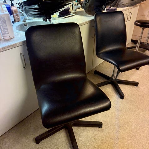 Rigtig flotte frisørstole, kan eventuelt bruges som kontorstole.. 2 stk. 500.- stykket