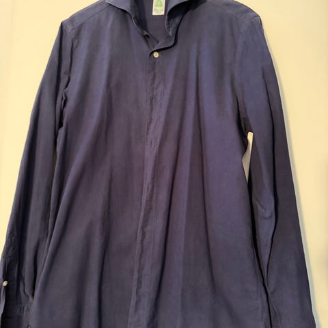Mørkeblå smalriflet fløjl. Den blå farve er bedst gengivet på billedet med skiltet i nakken