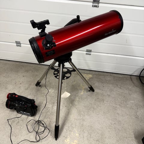 Skywatcher stjernekikkert 130mm 900mm. Lidt overfladisk rust på skruer. Nogle ridser på overfladen (kosmetisk). Et ben dele 3D printet- ses på billedet. Messer extra udstyr: okularer, kollimerende okular, månefilter, ses på billeder.
