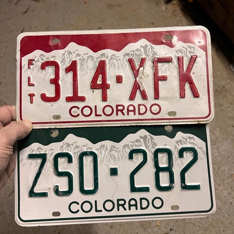 Nummerplade fra Colorado med registreringsnummer 826 PJG. Nummerpladen er lavet af metal og viser tegn i sort på hvid baggrund med et bjergrigt landskab i toppen. Nummerpladen har brugsspor og mindre buler.