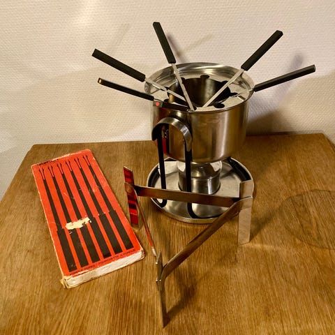 Stelton fondue sæt - incl gafler ( tror ikke det er Stelton ). Alle dele der er i berøring med mad er i rustfrit stål Fremstår meget velholdt. Kan bruges til både olie , rødvin , ost etc. Meget flot sæt