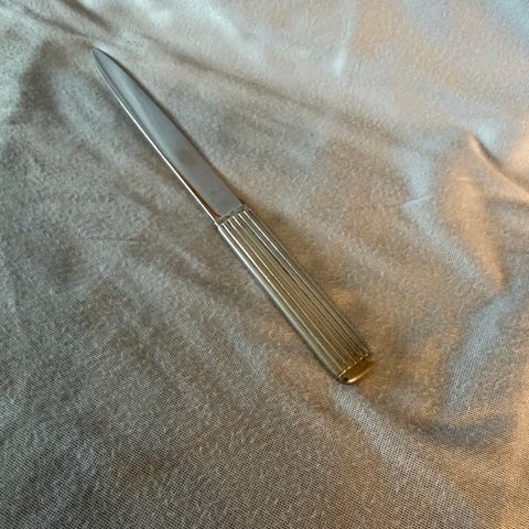 Velholdt brevåbner fra 70'erne. Måler 24,5 cm. Ukendt træsort. Mærket med DKF 649. Sender gerne.