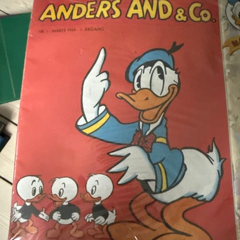 Walt Disney Anders And & Co. metalplade med motiv af Anders And og hans nevøer. Pladen er rød med farverige illustrationer og har fire monteringshuller i hjørnerne. Velegnet til vægophæng som dekorativt element.