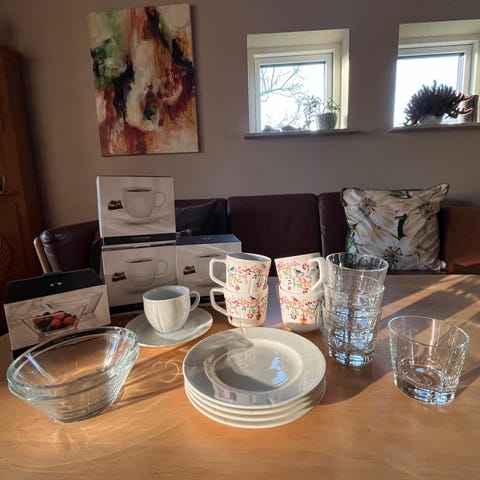 24 kaffekopper, 24 underkopper, 24 desserttallerken, 24 Pastatallerken, 24 Dyb tallerken, 4 tekrus.