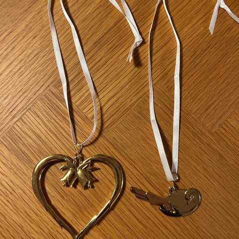 Georg Jensen Julepynt designet til jul. Dekoration i guldfarvet materiale med et motiv af to nisser, som spiser grød.
