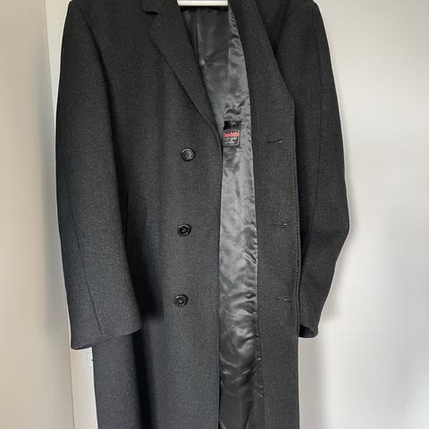 Frakken er i rigtig flot stand og lavet i et kraftigt uldmix, som holder godt på varmen og falder smukt på kroppen.