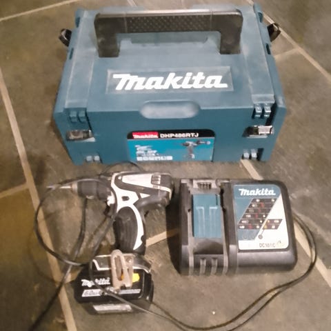 Makita DDF484 18V boremaskine med justerbar momentindstilling op til 19 trin. Batteridrevet med lithium-ion batteri, designet til alsidig brug i forskellige bore- og skrueopgaver. Farve: Blå/sort.