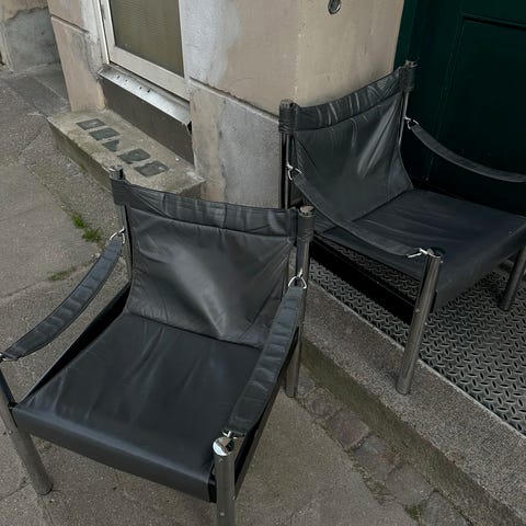 Lænestole/Clubchairs,lavrygget betrukket med brunt læder.