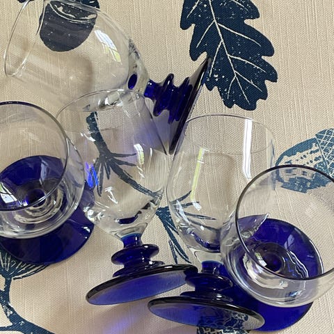 Vinglassene blev købt i Tyskland. De er dejlig tynd og bred. d= ca37cm, åbning= ca 8cm, h=ca 22cm