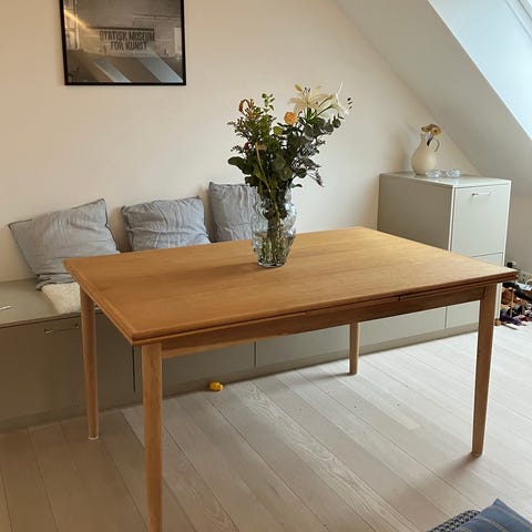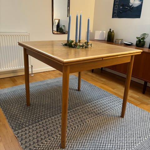 Lækker spisebord af egetræ med hollandsk udtræk fra 1960'erne. L. 122/222 cm. B. 82 cm. H. 75 cm. Frem står i super stand med en meget smuk patina. Evt kan lev aftales.