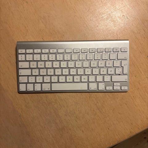 Apple tastatur med kabel i hvid farve. Tastaturet har et fuldt layout med numerisk del. Designet til brug med computere og tilbyder standard funktionstaster og piletaster.