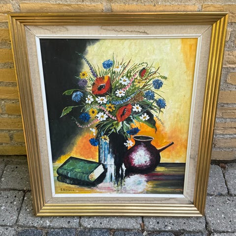 Maleri af E. Kaysen. Måler 80 x 66 cm. med motiv af et landskab, der inkluderer en buebro, træer og en sø. Maleriet er indrammet i en dekorativ ramme.
