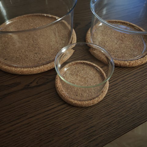 Bodum glas skål med tilhørende korkunderlag. Skålen er fremstillet i klart glas, og underlaget er lavet af kork. Skålen er egnet til servering og opbevaring af madvarer, men skal ikke bruges direkte på komfur eller varmekilder. 2,5 liter