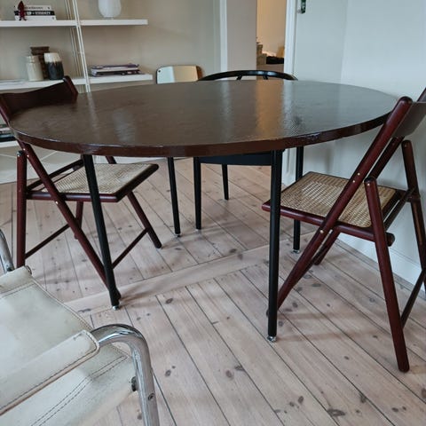 Rund bordplade, hvid malet og lakeret. Der er indsæt til bordben som måler 55x55. Bordpladen er 120 diameter og er i god stand, dog med enkelte tegn på slid.
