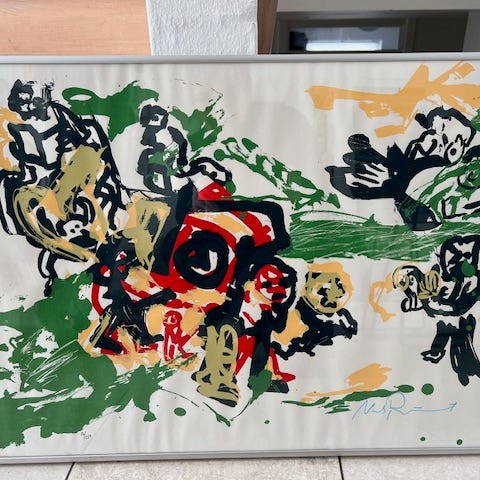 Niels Reumert litografi med nummerering 422 ud af 482. Signeret og dateret 78. Farverig og detaljeret kunsttryk med abstrakte og figurative elementer.