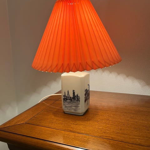 Kaiser bordlampe med en orange plisseret lampeskærm og en hvid keramisk fod med håndmalede blomster i rosa nuancer. Lampen er fra 1979 og har en klassisk stil. Kan sælges med og uden skærm. H 30/37, skærm H 22