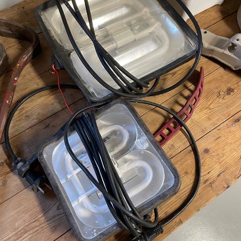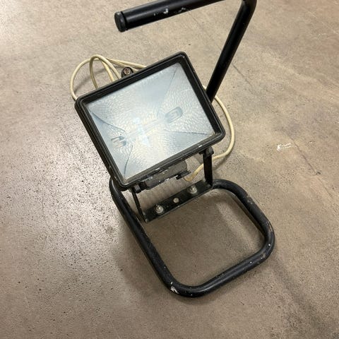 Nortec arbejdslampe med integreret håndtag og fod. Lampen har et robust design med gul og grå farve, velegnet til forskellige arbejdsopgaver. Strømforsynes via kabel tilslutning.