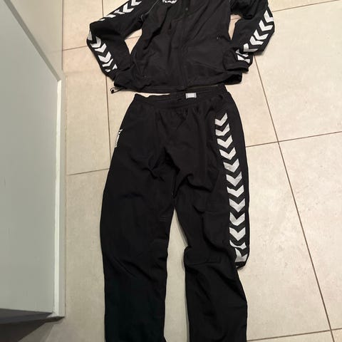 Hummel træningssæt til herre i størrelse M, bestående af bukser og hættetrøje i grøn farve. Sættet er egnet til forskellige sportsaktiviteter.