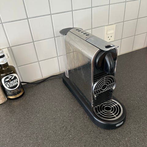 DeLonghi Nespresso maskine med alt tilbehør. Virker uden problemer, ofte afkalker med rigtig afkalker.